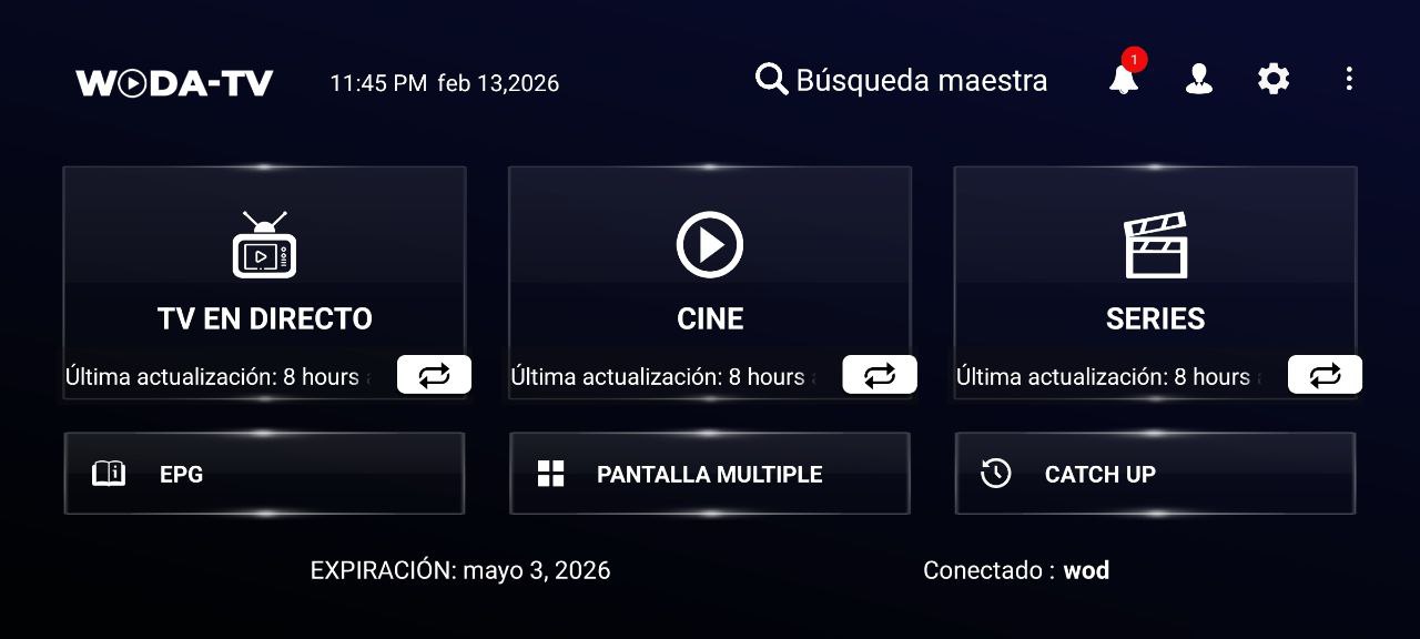WODA TV XCIPTV ADS muestra fecha de vencimiento de tu servicio, muestra anuncios de películas y series recomendadas en español, opción para ver varios canales simultáneos y es la más fácil de usar y recomendada.